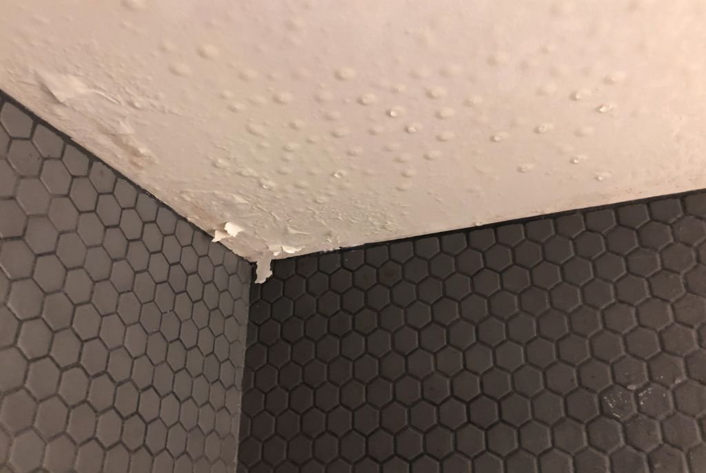 - Zacieki na suficie, szczególnie w rogach pomieszczeń lub wokół wywiewek.
