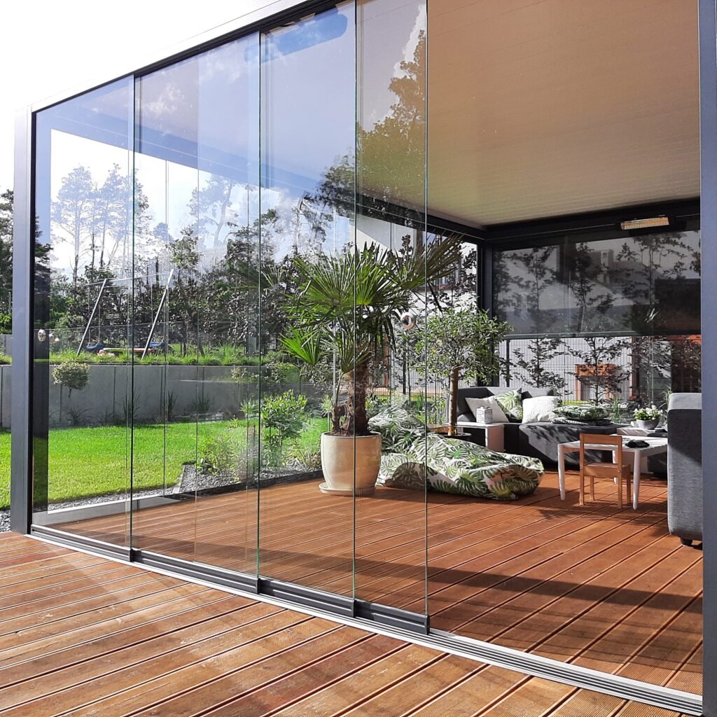 Szklane oraz przeciwsłoneczne zabudowy tarasów oferowane przez Koraj nadają pergolom bardziej uniwersalny charakter. Przezroczyste panele chronią przed wiatrem i opadami, zachowując kontakt z otoczeniem. Systemy przesuwne pozwalają elastycznie reagować na zmiany pogody oraz potrzeby użytkowników.